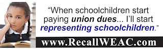 MADISON, Wis. -- A billboard along the Beltline is getting drivers' attention with a message targeting the Education Association Council, the state's largest teachers union.The new sign appeared over the weekend, with the quote, "When schoolchildren start paying union dues, I'll start representing schoolchildren." Below the quote is a web address for a group calling itself Recall WEAC, recently formed as a political action committee.Read entire article HERE.
